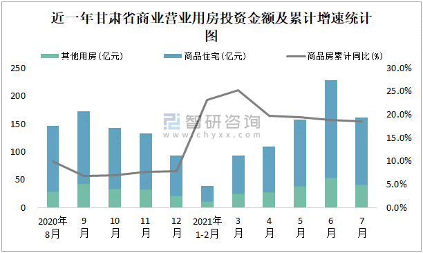 根據國家統計局數據統計可知:2021年7月甘肅省房地產開發投資商品房投資金額為162.06億元,其中包括辦公樓、商業營業用房等其他用房40.88億元(注:辦公樓、商業營業用房未分開統計);2021年1-7月甘肅省房地產開發投資包括商業營業用房在內的其他用房累計金額為199.8億元。