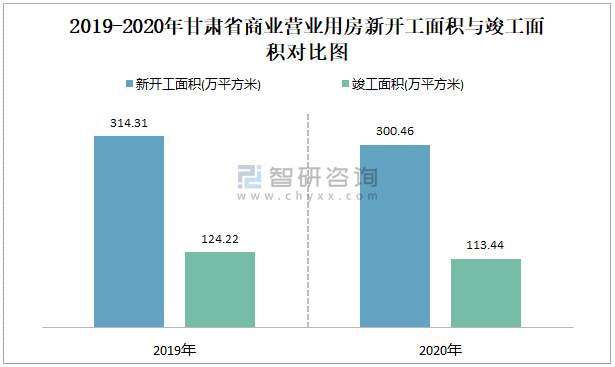 2019-2020年甘肅省商業營業用房新開工面積與竣工面積對比圖