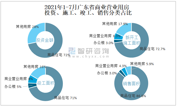 2021年1-7月廣東省商業(yè)營業(yè)用房投資、施工、竣工、銷售分類占比