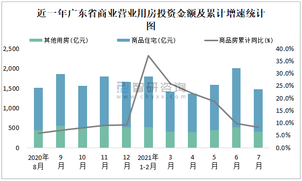 近一年廣東省商業(yè)營業(yè)用房投資金額及累計增速統(tǒng)計圖