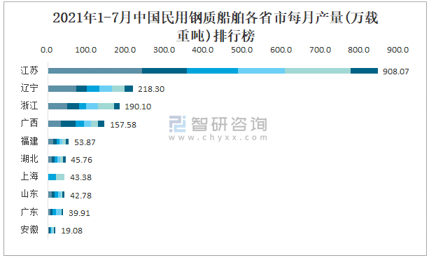 2021年1-7月中國民用鋼質船舶各省市每月產量排行榜