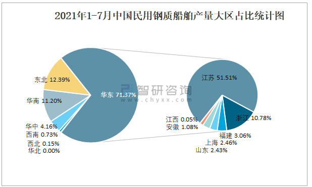 2021年1-7月中國民用鋼質船舶產量大區占比統計圖