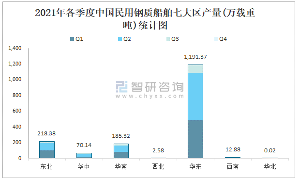 2021年各季度中國民用鋼質船舶七大區產量統計圖