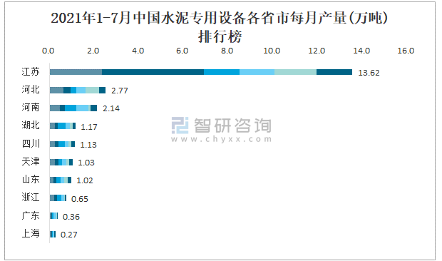 2021年1-7月中國(guó)水泥專(zhuān)用設(shè)備各省市每月產(chǎn)量排行榜