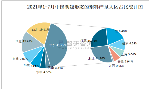 2021年1-7月中國初級形態的塑料產量大區占比統計圖