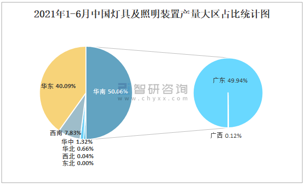 2021年1-6月中國燈具及照明裝置產量為25億套(臺、個) 華南地區產量最高(占比50.06%)