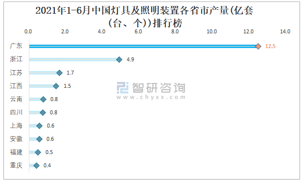 2021年1-6月中國燈具及照明裝置各省市產量排行榜