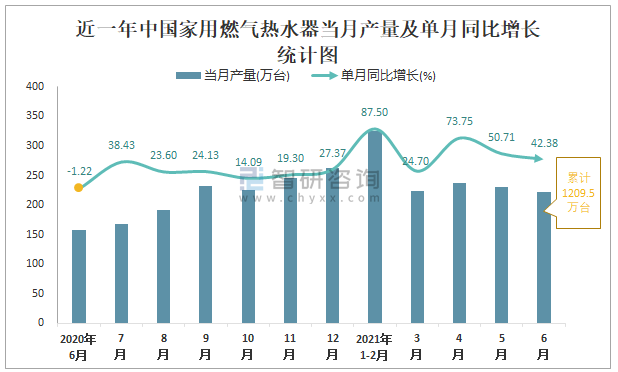 根據國家統計局數據顯示:2021年6月中國家用燃氣熱水器產量為222萬臺,同比增長42.38%;2021年1-6月中國家用燃氣熱水器累計產量為1209.5萬臺,同比增長56.95%;2015-2020年中國家用燃氣熱水器產量總體呈現上升趨勢,2020年達到最高。