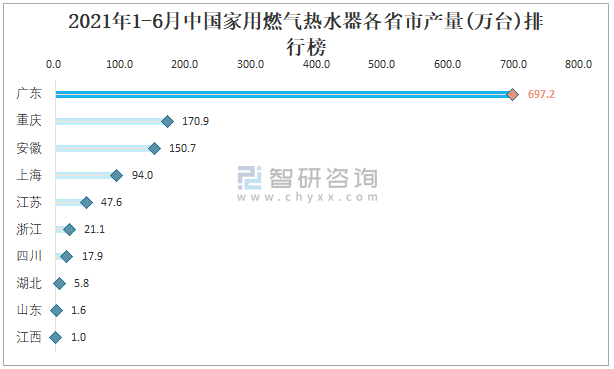 2021年1-6月中國家用燃氣熱水器各省市產量排行榜