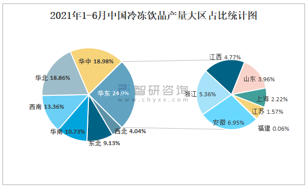 2021年1-6月中國冷凍飲品產量大區占比統計圖