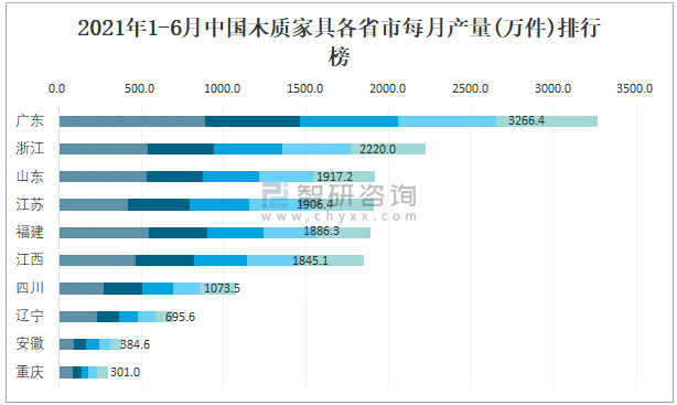 2021年1-6月中國木質家具各省市每月產量排行榜