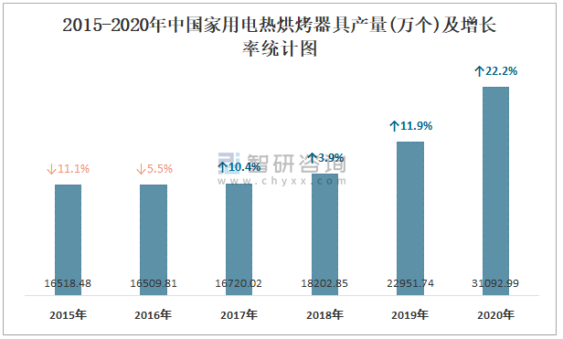 2015-2020年中國家用電熱烘烤器具產量及增長率統計圖