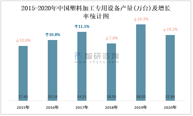 2015-2020年中國塑料加工專用設備產量及增長率統計圖