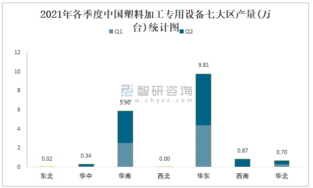 2021年各季度中國塑料加工專用設備七大區產量統計圖