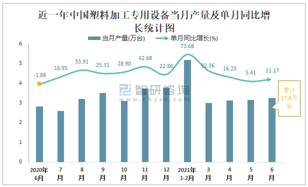 根據國家統計局數據顯示:2021年6月中國塑料加工專用設備產量為3.3萬臺,同比增長11.17%;2021年1-6月中國塑料加工專用設備累計產量為17.6萬臺,同比增長35%;2015-2020年中國塑料加工專用設備產量2019年達到最高,次年有所下滑。