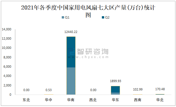 2021年各季度中國家用電風扇七大區產量統計圖