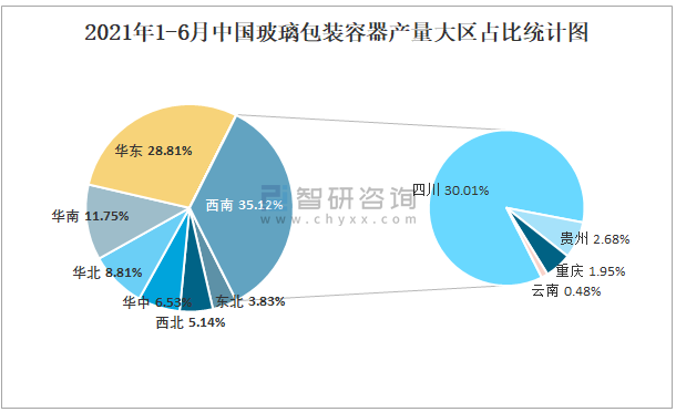 2021年1-6月中國(guó)玻璃包裝容器產(chǎn)量大區(qū)占比統(tǒng)計(jì)圖
