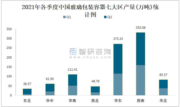 2021年各季度中國(guó)玻璃包裝容器七大區(qū)產(chǎn)量統(tǒng)計(jì)圖