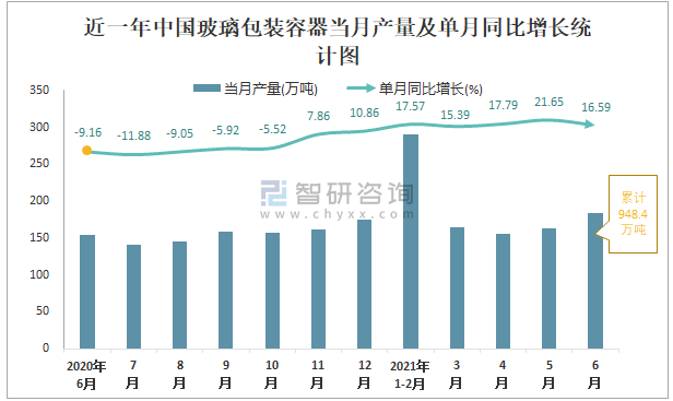根據(jù)國(guó)家統(tǒng)計(jì)局?jǐn)?shù)據(jù)顯示:2021年6月中國(guó)玻璃包裝容器產(chǎn)量為184萬(wàn)噸,同比增長(zhǎng)16.59%;2021年1-6月中國(guó)玻璃包裝容器累計(jì)產(chǎn)量為948.4萬(wàn)噸,同比增長(zhǎng)16.4%;2015-2020年中國(guó)玻璃包裝容器產(chǎn)量2018年跌至最低,次年有所回升。