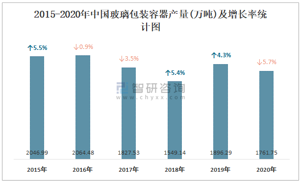 2015-2020年中國(guó)玻璃包裝容器產(chǎn)量及增長(zhǎng)率統(tǒng)計(jì)圖