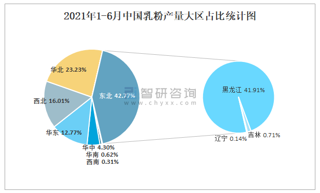 2021年1-6月中國(guó)乳粉產(chǎn)量大區(qū)占比統(tǒng)計(jì)圖