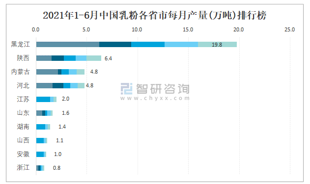 2021年1-6月中國(guó)乳粉各省市每月產(chǎn)量排行榜