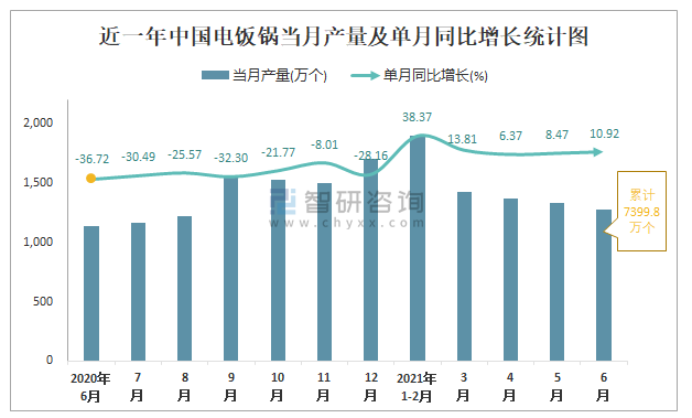 根據國家統計局數據顯示:2021年6月中國電飯鍋產量為1273萬個,同比增長10.92%;2021年1-6月中國電飯鍋累計產量為7399.8萬個,同比增長18.11%;2015-2020年中國電飯鍋產量2016年達到最高,此后逐年遞減。