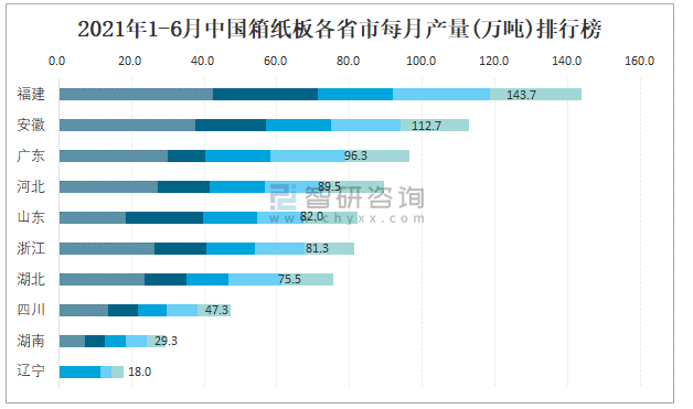 2021年1-6月中國箱紙板各省市每月產(chǎn)量排行榜