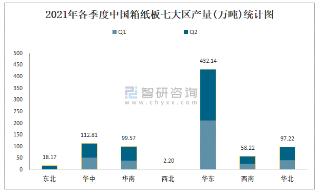 2021年各季度中國箱紙板七大區(qū)產(chǎn)量統(tǒng)計(jì)圖