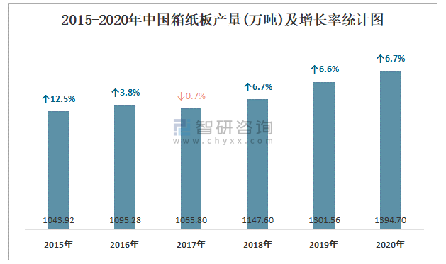 2015-2020年中國箱紙板產(chǎn)量及增長率統(tǒng)計(jì)圖