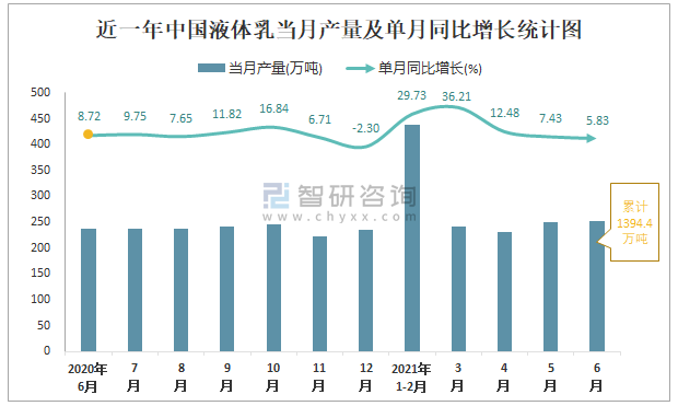 根據國家統計局數據顯示:2021年6月中國液體乳產量為252萬噸,同比增長5.83%;2021年1-6月中國液體乳累計產量為1394.4萬噸,同比增長17.65%;2015-2020年中國液體乳產量2018年跌至最低,此后逐年遞增。