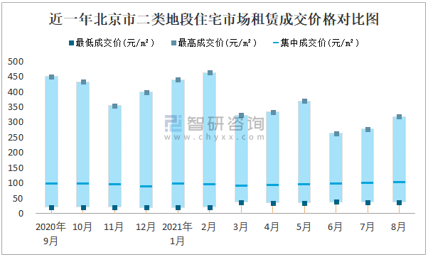根據國信房地產信息網數據可知:近一年北京市一類地段住宅市場租賃成交價格有一定幅度波動,8月最高成交價與最低成交價差距為215.8元/m²;近一年北京市二類地段住宅市場租賃最低成交價與最高成交價的差距在225.07元/m²-443.26元/m²之間波動,今年2月差距達到最大;近一年三類地段住宅市場租賃成交價在14.81元/m²-290元/m²之間波動。