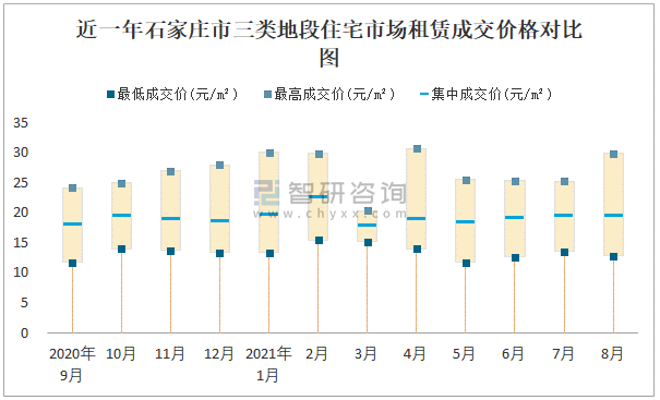 根據國信房地產信息網數據可知:近一年石家莊市一類地段住宅市場租賃成交價格有一定幅度波動,8月最高成交價與最低成交價差距為16.7元/m²;近一年石家莊市二類地段住宅市場租賃最低成交價與最高成交價的差距在15.57元/m²-30.31元/m²之間波動,今年4月差距達到最大;近一年三類地段住宅市場租賃成交價在11.7元/m²-30.66元/m²之間波動。