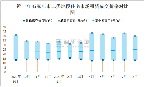 2021年8月石家莊市房屋租賃市場價格走勢:二類地段住宅市場租賃最高成交價最高,為40.44元/㎡
