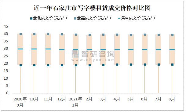 根據國信房地產信息網數據可知:近一年石家莊市商業用房租賃集中成交價比較穩定,在29元/m²-29.25元/m²之間波動,8月集中成交價為29.1元/m²;寫字樓租賃集中成交價波幅較小,在2020年9月達到最高值(29.5元/m²)。