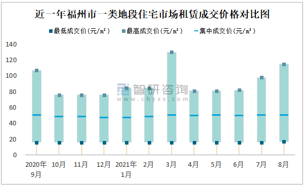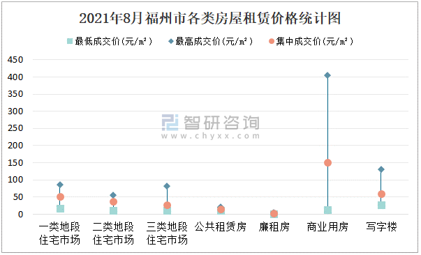 根據(jù)國信房地產(chǎn)信息網(wǎng)數(shù)據(jù)可知:2021年8月福州市7類房屋中,公共租賃房租賃集中成交價為15元/m²,廉租房租賃集中成交價為2.48元/m²;商業(yè)用房租賃最高成交價、集中成交價均高于其他類房屋價格,寫字樓租賃最低成交價最高,為26元/m²;三類地段住宅市場租賃集中成交價約為26元/m²,商業(yè)用房租賃集中成交價高于寫字樓租賃集中成交價。
