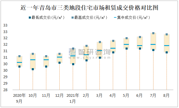根據國信房地產信息網數據可知:近一年青島市一類地段住宅市場租賃成交價格有一定幅度波動,8月最高成交價與最低成交價差距為0.9元/m²;近一年青島市二類地段住宅市場租賃最低成交價與最高成交價的差距在2.4元/m²-3.3元/m²之間波動,2020年10月差距達到最大;近一年三類地段住宅市場租賃成交價在29.6元/m²-32.4元/m²之間波動。