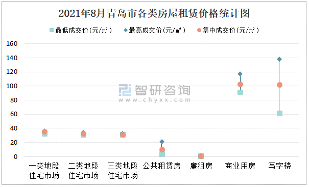 根據國信房地產信息網數據可知:2021年8月青島市7類房屋中,公共租賃房租賃集中成交價為10.38元/m²,廉租房租賃集中成交價為0.75元/m²;商業用房租賃最低成交價、集中成交價均高于其他類房屋價格,寫字樓租賃最高成交價最高,為137.9元/m²;三類地段住宅市場租賃集中成交價約為31.5元/m²,商業用房租賃集中成交價高于寫字樓租賃集中成交價。