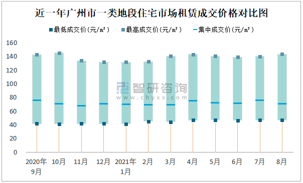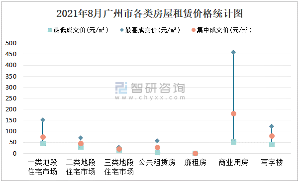 根據國信房地產信息網數據可知:2021年8月廣州市7類房屋中,廉租房無統計數據,公共租賃房租賃集中成交價為27.86元/m²;商業用房租賃最低成交價、最高成交價、集中成交價均高于其他類房屋價格;三類地段住宅市場租賃集中成交價約為21.83元/m²,商業用房租賃集中成交價高于寫字樓租賃集中成交價。