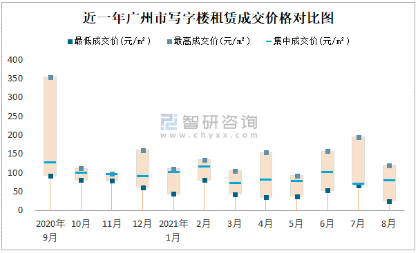 根據國信房地產信息網數據可知:近一年廣州市商業用房租賃集中成交價在0元/m²-340.26元/m²之間波動,8月集中成交價為340.26元/m²;寫字樓租賃集中成交價2020年9月達到最高值(126.05元/m²)。