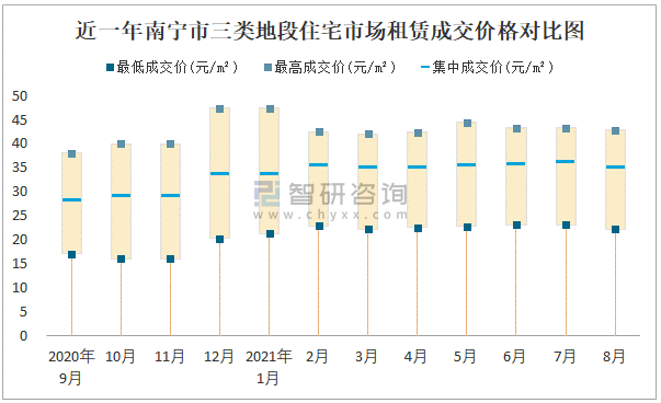 2021年8月南寧市房屋租賃市場價格走勢:一類地段住宅市場租賃價格在35.29元/㎡-78.29元/㎡之間,集中成交價約為58.93元/㎡