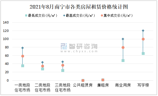 根據(jù)國信房地產(chǎn)信息網(wǎng)數(shù)據(jù)可知:2021年8月南寧市7類房屋中,公共租賃房無統(tǒng)計數(shù)據(jù),廉租房租賃集中成交價為1.5元/m²;寫字樓租賃最低成交價、最高成交價、集中成交價均高于其他類房屋價格;三類地段住宅市場租賃集中成交價約為37元/m²,寫字樓租賃集中成交價高于商業(yè)用房租賃集中成交價。