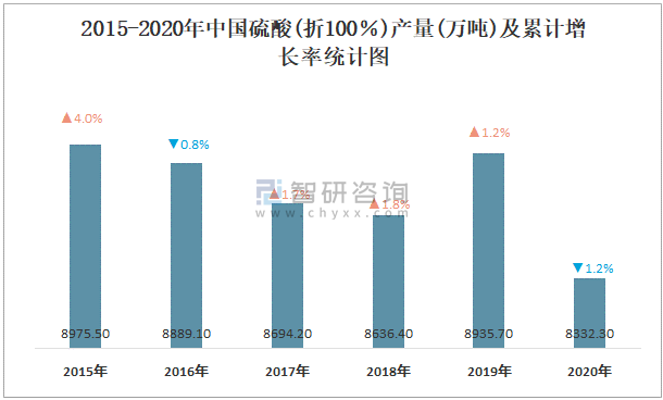 2015-2020年中國硫酸(折100%)產量及增長率統計圖