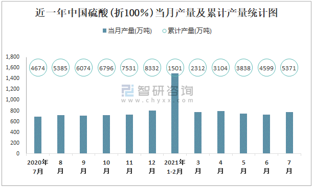 根據國家統計局數據顯示:2021年7月中國硫酸(折100%)產量為774萬噸,同比增長4.7%;2021年1-7月中國硫酸(折100%)累計產量為5370.5萬噸,累計增長8.5%;2015-2020年中國硫酸(折100%)產量2019年起大幅度下降,2020年跌至最低值。