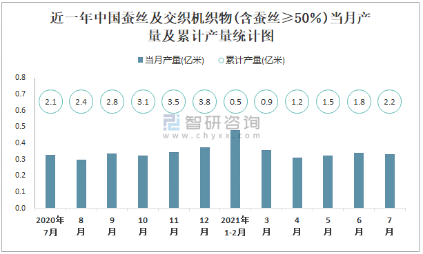 2021年1-7月中國蠶絲及交織機織物(含蠶絲≥50%)產量為2.2億米 累計增長0.4%