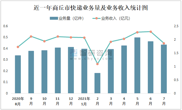 根據各省市郵政局數據可知:2021年7月商丘市快遞業務量為4346.65萬件,業務收入為18661.21萬元;2021年1-7月商丘市快遞累計業務量為27918.01萬件,同比增長66.42%,累計業務收入為135811.61萬元,同比增長53.74%;2016-2020年商丘市快遞業務量與業務收入均逐年遞增,平均單價逐年遞減。
