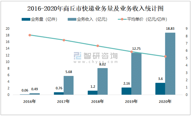 2016-2020年商丘市快遞業務量及業務收入統計圖