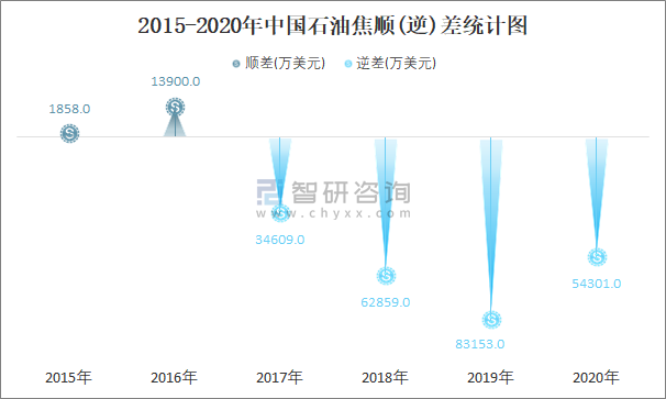 2015-2020年中國石油焦順(逆)差統(tǒng)計圖