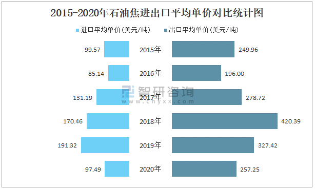 2015-2020年石油焦進出口平均單價對比統(tǒng)計圖