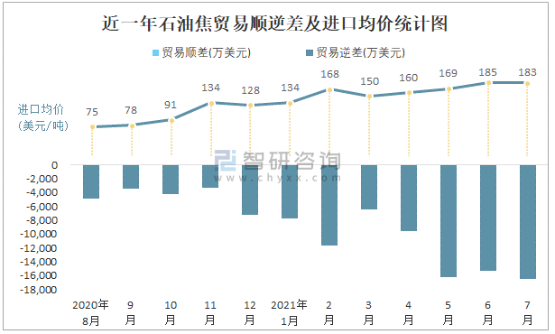 近一年石油焦貿(mào)易順逆差及進口均價統(tǒng)計圖